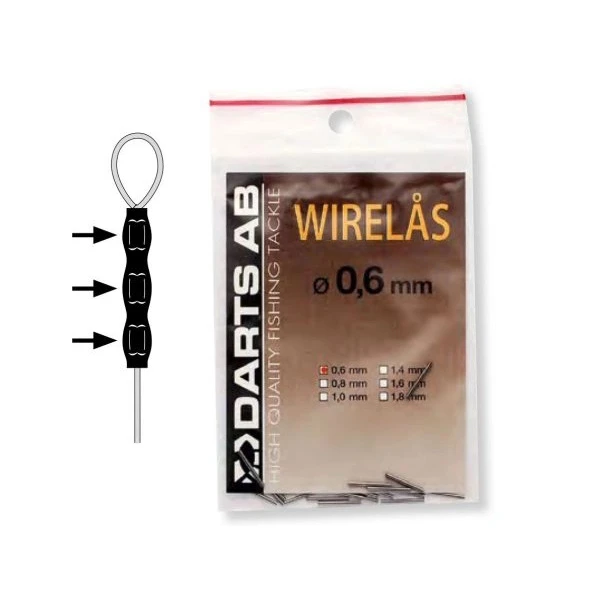 Wirelock wird verwendet, um eine starke und flexible Verriegelung von Draht, Nylon- oder Fluorocarbonschnur zu geben.50 pro PackungErhältlich in den folgenden Größen• 0,6 mm• 0,8 mm• 1,0 mm• 1,4 mm• 1,6 mm• 1,8 mm