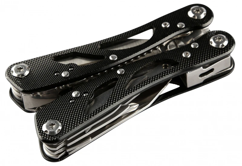 Universalwerkzeug mit 10 FunktionenSpaltringzange (schneidet auch Geflecht)SchereSägeKapselöffnerSchraubendreherSchraubendreher (gerade)AhleMesserAushakenLänge: 10,5 cm (gefaltet)